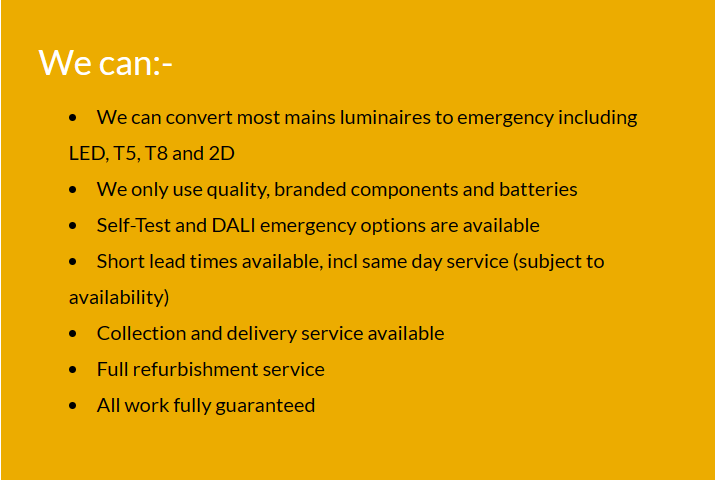 We are able to convert a large array of light fittings to Emergency and Dimmable options, including DALI and 1-10v, Central Battery and Self Test – all completed by our in-house manufacturing team, using branded gear.